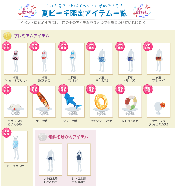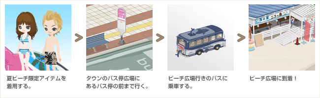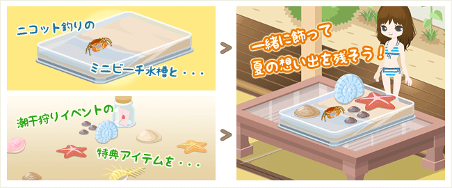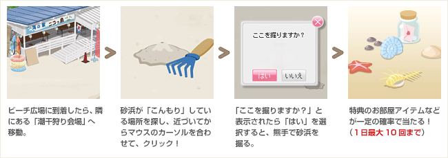 「夏ビーチ限定アイテム」を着用すれば、ビーチ広場で開催中の「潮干狩り」のイベントに参加できます。砂浜を掘って、特典のお部屋アイテムを探し出しましょう!