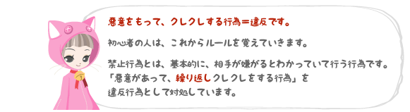 現実の世界と同じく、知らない人に、プレゼントをおねだり(クレクレ)する行為はトラブルとなります。 特に、相手が嫌がってるのに、繰り返しアイテムをおねだりした場合、それはマナー違反ではなく、 「悪意がある行為=利用規約の違反」となり、IDの停止などを取る場合もありますのでご注意ください。