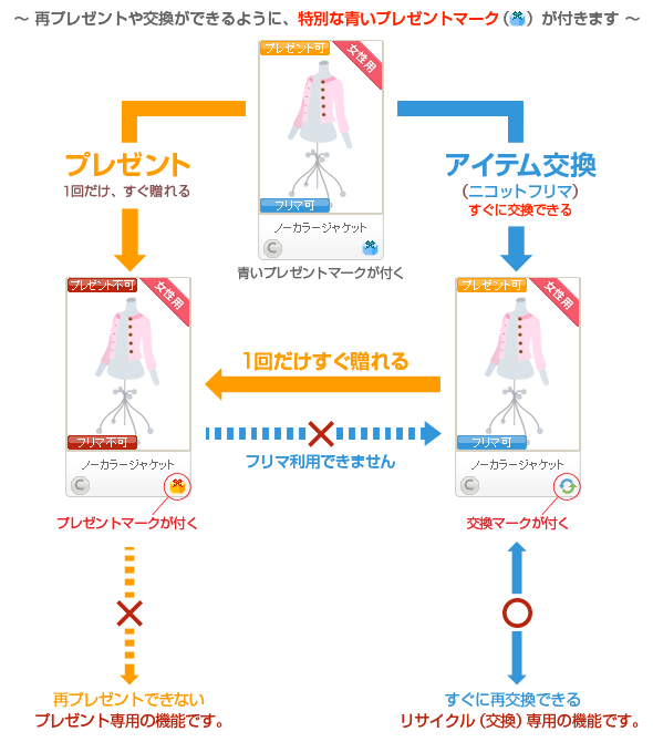 フリマ機能のルールでは、「プレゼントされたアイテムは、フリマで利用できない」というルールになりますが、