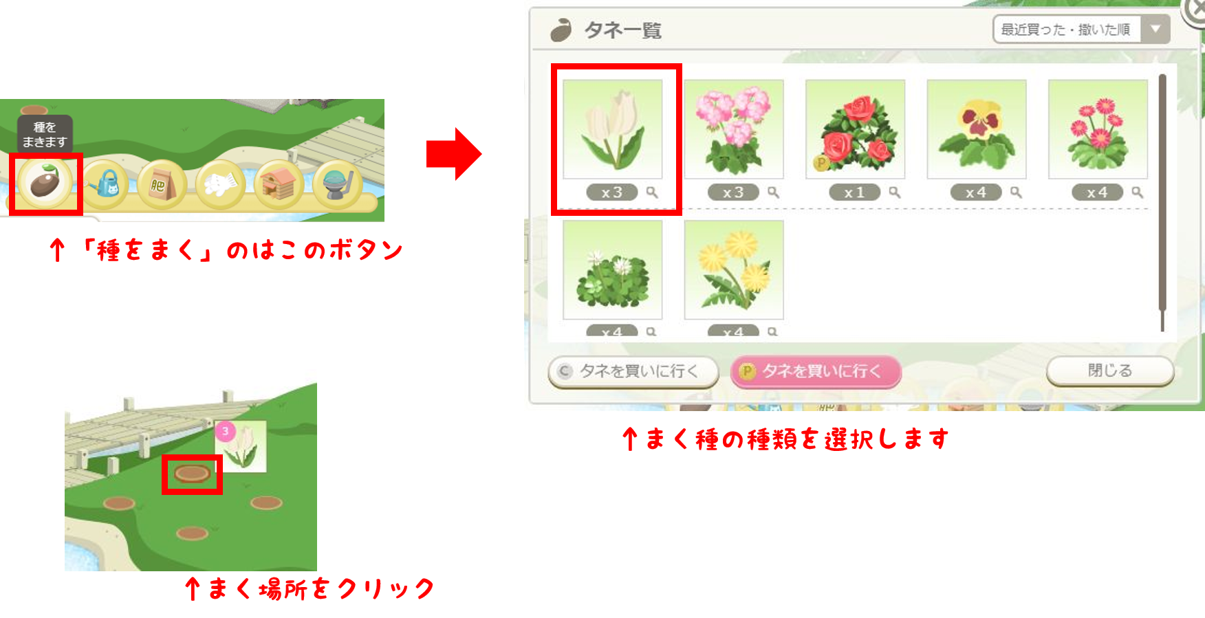 最初は、早く育ちやすい「タンポポ」がおすすめです。(無料コインで買えます)