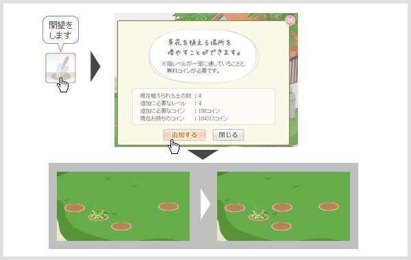 (2)1つ追加するのに必要な無料コインと、ガーデンレベルが表示されます。