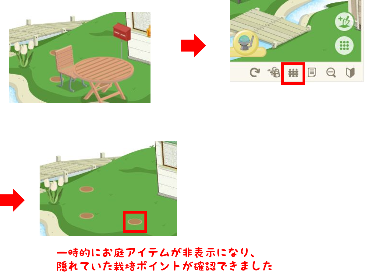 (2) 配置したお庭アイテムが、一時的に非表示状態になりますので、お庭アイテムに