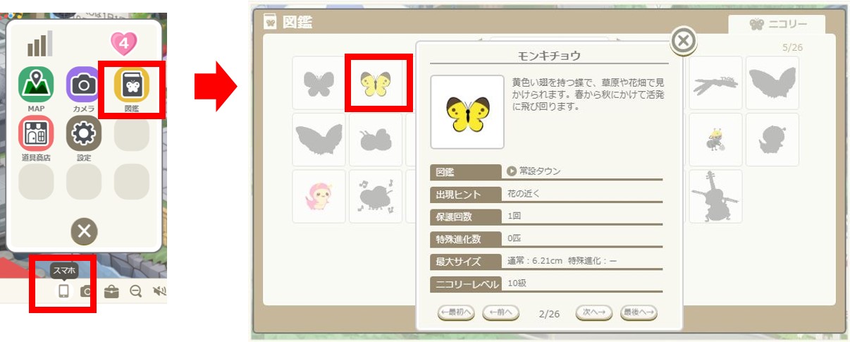 図鑑は、スマホアイコン(タウン画面右下)の「図鑑」アプリから表示できます。