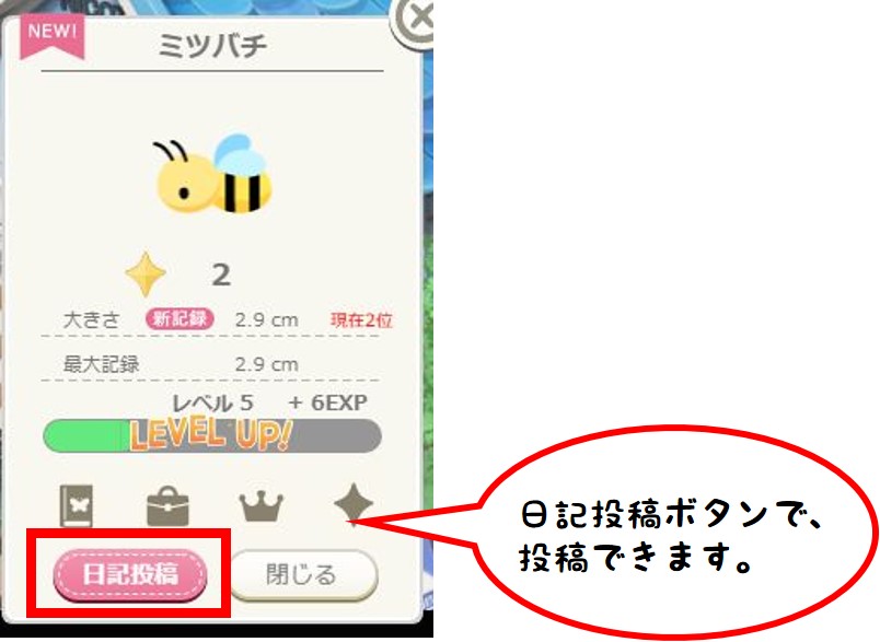 ニコリーを保護したあとの画面の日記投稿ボタンから、
