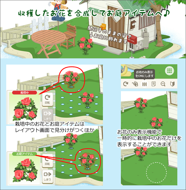ニコットガーデンにて収穫したお花をお庭アイテム化できます。