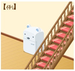 とびらが開くシロクマ冷蔵庫(アニメ家具)が「赤じゅうたんの階段」の後ろに
