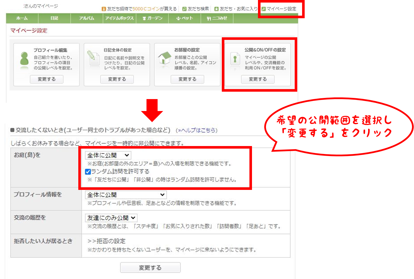 上記のお庭(島)の設定を「友だちに公開」「非公開」に設定いただくか、