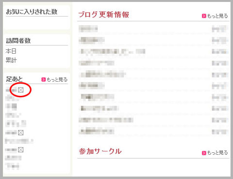 自分のページのTOP左側のエリアの「足あと」リストの下に、