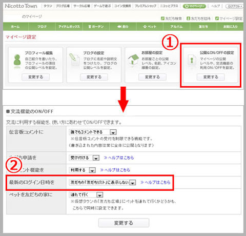 「マイページ>マイページ設定」>「公開&ON/OFFの設定」より、