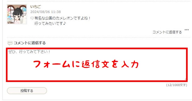 ②返信フォームが下に出てくるので、返信コメントを入力し「投稿する」をクリック