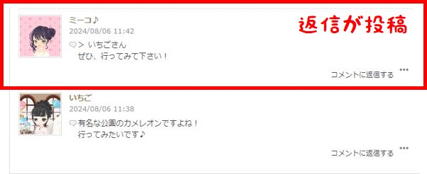 コメントを入力し、「投稿する」をクリックで、相手の方のニックネーム付きで、