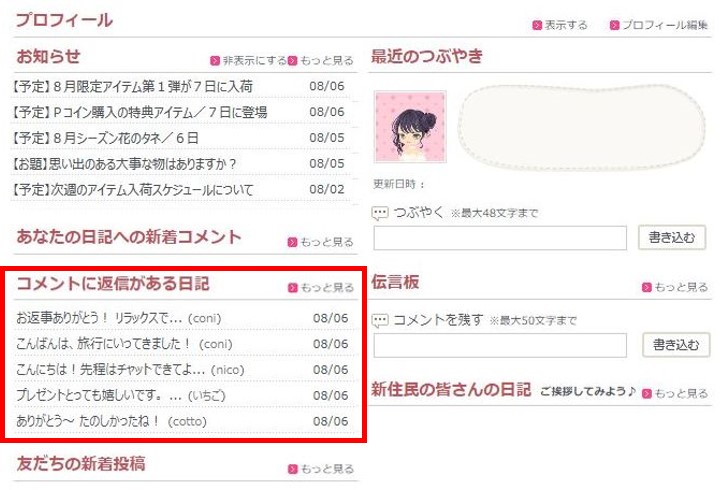 返信コメントの一覧は、マイページの「コメントに返信がある日記」の項目で確認でき、
