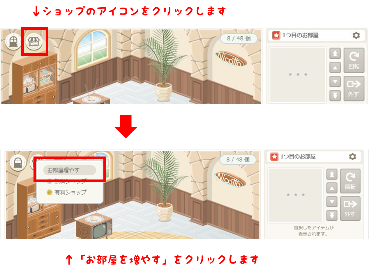 ・2部屋~7部屋目までは、2000コイン(無料コイン)で増やせます。