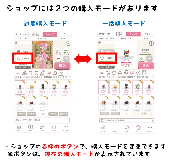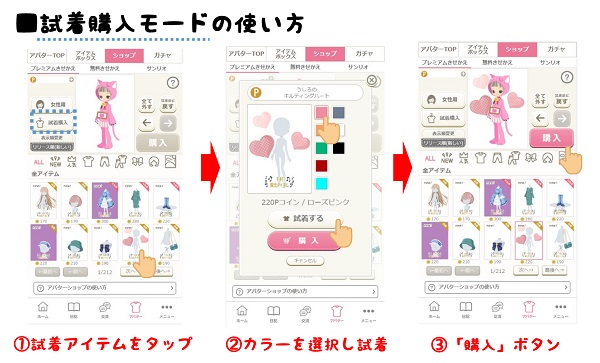 タップしたアイテムを、アバターが試着して購入するモードです。