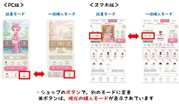 また、「試着購入」を押すと「試着購入モード」から「一括購入モード」に切り替わります。