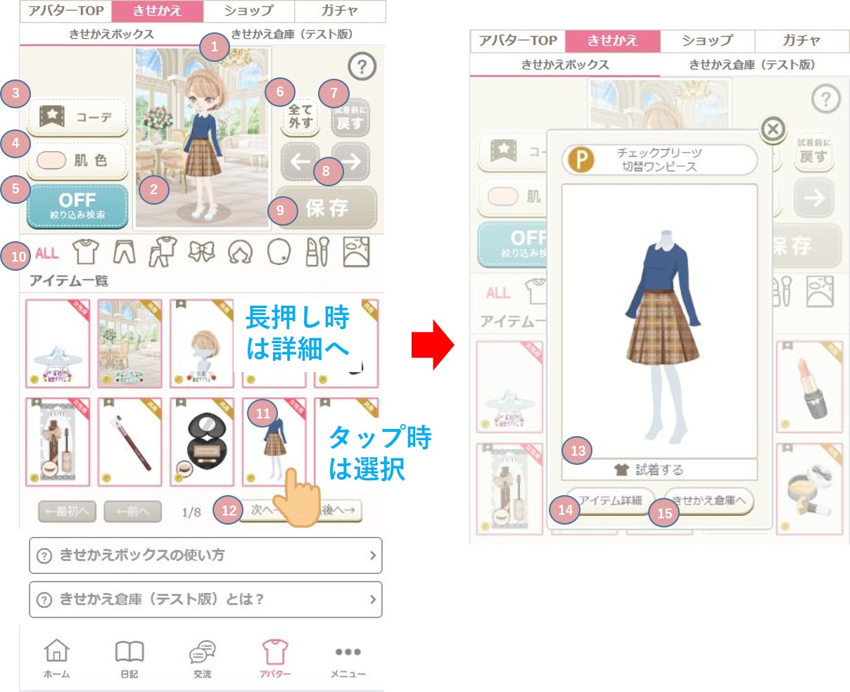きせかえは「⑪着せたいアイテムをタップして選ぶ」、