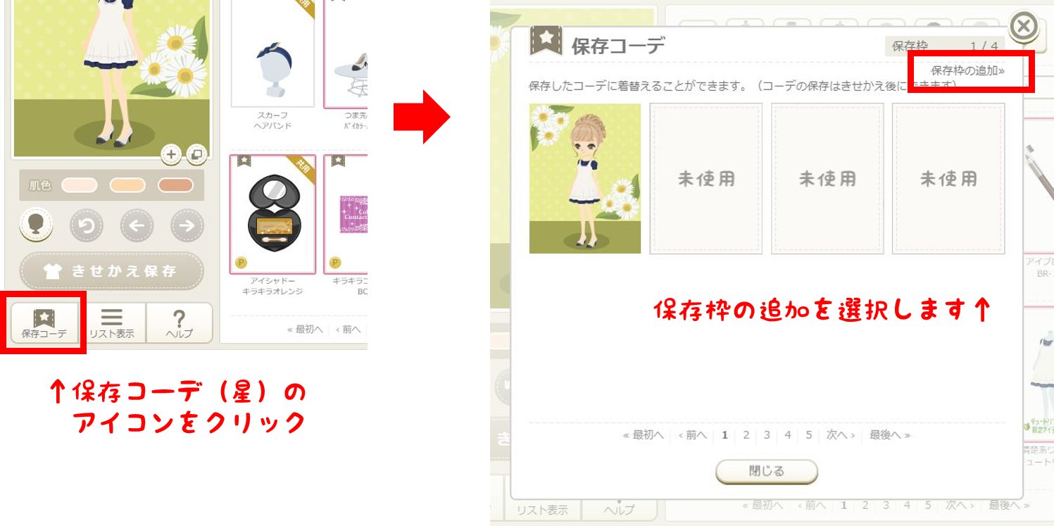 ◆無料コインでコーデ保存枠を追加 = 2000コイン / 1枠